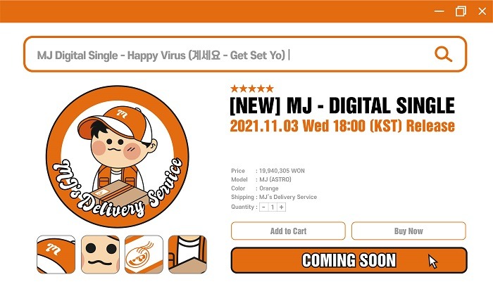 MJ의 시그니처 컬러인 오렌지 톤이 돋보이는 해당 커밍순 이미지에서 다양한 힌트를 확인할 수 있다. 먼저 구매 창을 연상하게 하는 화면 속 MJ를 귀엽게 표현한 캐릭터가 택배 상자를 들고 있는 듯한 모습과 ‘MJ’s Delivery Service’라는 문구가 새로운 콘셉트에 대한 궁금증을 고조시킨다.