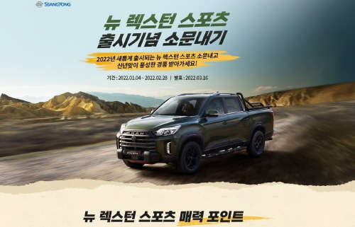 '소문내기' 이벤트와 같은 기간(2/28일까지) 진행되며 추첨을 통해 ▲뉴 렉스턴 스포츠 다이캐스트+백화점 5만 원 상품권(3명) ▲백화점 5만 원 상품권(5명) ▲스타벅스 커피교환권(100명) 등 푸짐한 경품을 제공한다.