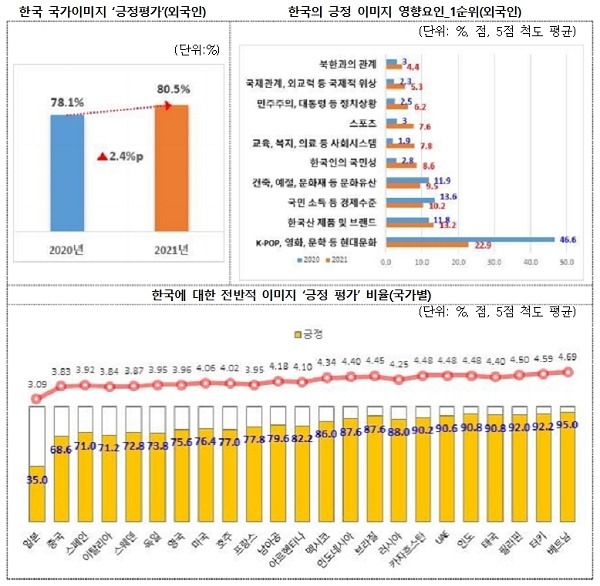 지난해 외국인이 본 한국에 대한 전반적인 국가이미지는 긍정 평가가 80.5%로 전년(78.1%)보다 2.4%p 상승한 것으로 나타났다. 국가별로 보면 베트남(95%), 터키(92.2%), 필리핀(92%), 태국(90.8%) 등 7개 국가에서는 10명 중 9명 이상이 대한민국의 국가이미지를 긍정적으로 평가했다. 일본의 경우에는 긍정 평가가 35%로, 전년(27.6%)보다 7.4%p 크게 상승하며, 조사 이래 최초로 부정 평가(26.6%)보다 높게 나타났다.