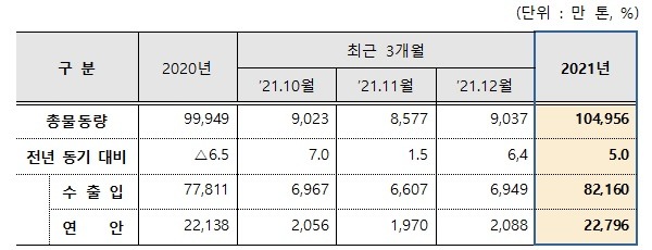 한편 전국 항만의 지난해 비컨테이너 화물 물동량은 10억 4956만 톤으로 5.0% 증가했고, 광양항과 인천항, 평택·당진항 등은 증가세를 나타냈으나 울산항은 감소세를 나타냈다.
