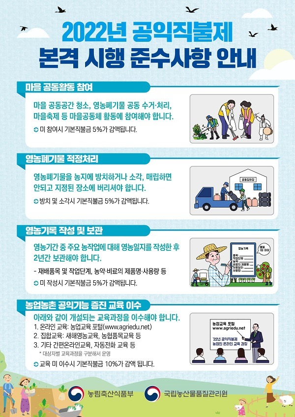 다만 ▲영농폐기물 적정 처리 ▲마을공동체 활동 참여 ▲영농일지 작성 준수사항은 현장 여건을 고려해 2년의 계도기간을 거쳐 올해부터 본격 시행된다.