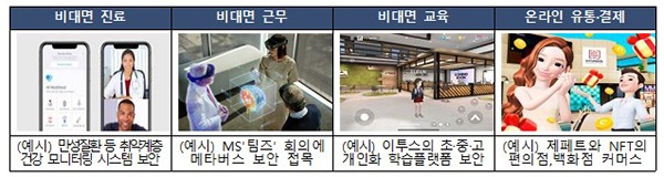 아울러 코로나19로 인해 원격근무·교육 등 비대면 문화가 확산되면서 국민의 일상생활 속 비대면 서비스와 메타버스, 무인점포 등 신규비대면 서비스 보안위협에 대응해 디지털·비대면 서비스에 보안을 적용 한다.
