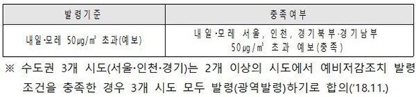 환경부 소속 수도권대기환경청은 서울특별시·인천광역시·경기도가 11일 오전 6시부터 밤 9시까지 수도권 전역에 ‘예비저감조치’를 발령·시행한다고 전했다.