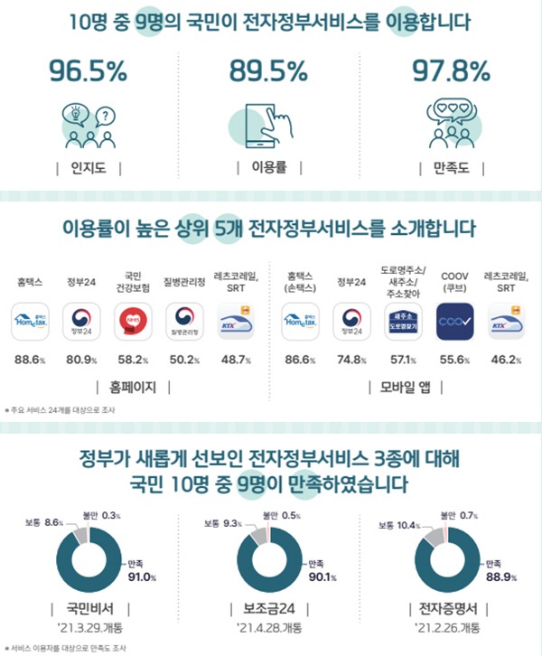 2021년 한 해 동안 국민 10명 중 9명 정도가 전자정부서비스를 이용했고, 이 중 97.8%가 서비스에 만족한 것으로 나타났다.