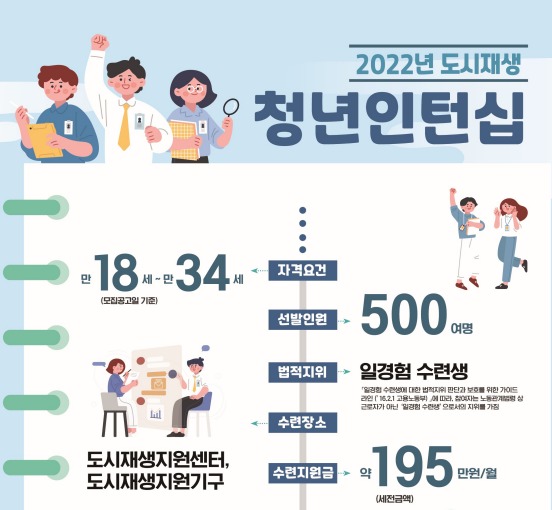국토교통부와 주택도시보증공사는 5.9(월)부터 ‘22년도 도시재생 청년인턴을 모집한다고 밝혔다.