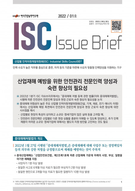1분기 ISC 이슈브리프에서는 2022년 1월 27일 시행된 ‘중대재해 처벌 등에 관한 법률(이하 중대재해처벌법)’이 산업계에 미치는 영향에 대해 살펴보았다.
