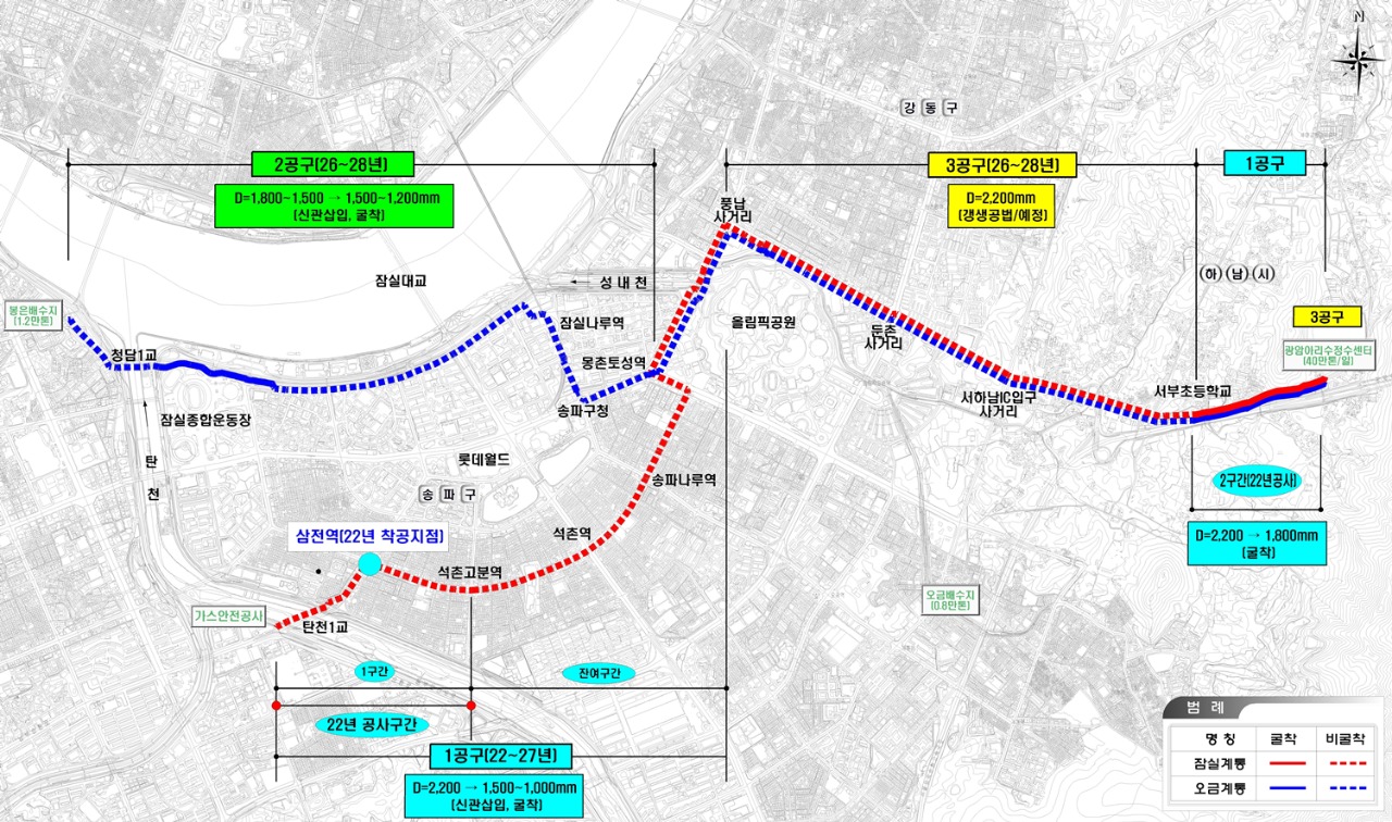 본격적인 공사는 오는 8월부터 시행되며, 1공구 중 탄천1교에서 9호선 석촌고분역 간 1.3㎞구간과 광암아리수정수센터(하남시 광암동)에서 서부초등학교(하남시 강일동) 간 1.3㎞를 합한 총 2.6㎞구간의 수도관을 적정 관경의 수도관으로 교체하는 공사가 우선 추진된다.