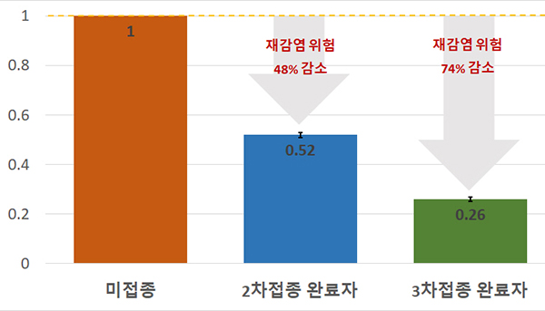 실제로 재감염 추정사례 발생 관련 요인 위험도를 분석한 결과 예방접종 횟수가 증가할수록 재감염 위험도는 감소한 것으로 나타났다. 미접종군에 비해 2차접종 완료군은 48%, 3차접종 완료군은 74% 재감염 발생 위험이 낮았다.