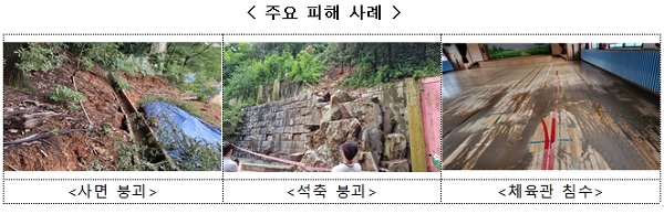 현장 점검을 통해 파악된 집중호우 피해학교는 14개 시도교육청의 332개교(기관)로 집계됐으며 주요 피해는 사면 붕괴, 석축·축대 파손, 건물 침수 등이었다.
