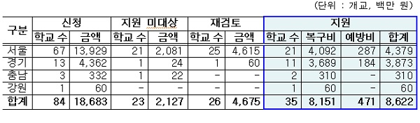이번 재해대책 특별교부금은 교육시설공제에 가입하지 않은 학교와 공제급여 및 자체 예산만으로는 복구가 어렵거나 추가 피해예방을 위해 시설 개선이 필요한 학교에 지원됐다.