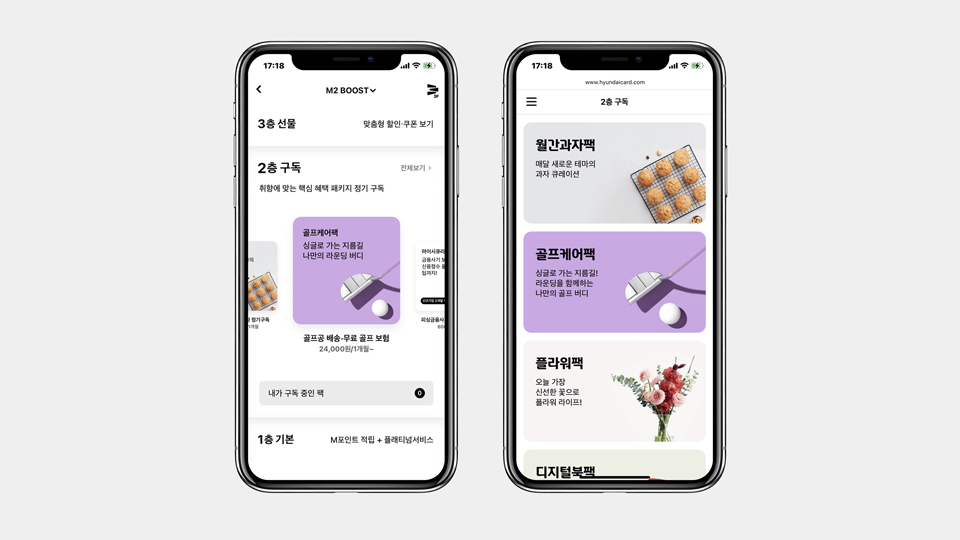 현대카드는 라이프스타일 트렌드와 고객의 다채로운 취향을 고려해 ‘2층 구독’ 서비스 라인업을 확장했다. 이번 업그레이드에서는 골프 보험 혜택 및 골프공 정기 배송으로 구성된 ‘골프케어팩’, 롯데제과의 다양한 제품을 매월 정기 배송 받는 ‘월간과자팩’이 새롭게 추가됐다.