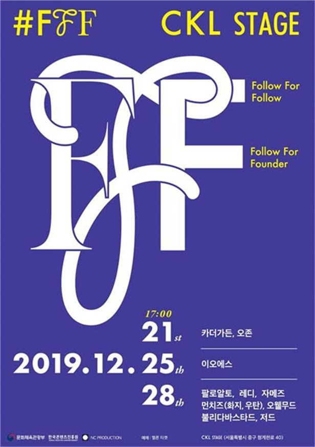 이번 CKL스테이지 기획공연 <#FFF>는 오는 12월 21일, 25일, 28일 3일간 창작의 장인 CKL스테이지에 올해 핫 키워드를 접목시켜 색다른 공연을 선보인다. 2019년 대중음악 트렌드를 아우르는 대표 키워드인 #오디션, #라이징스타, #온라인탑골공원, #힙합에 맞는 뮤지션으로 구성한 콘서트가 마련될 예정이다.