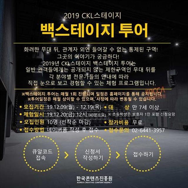 만 7세 이상이라면 누구나 참여 가능한 <백스테이지 투어>는 매월 1회 진행되며 선착순으로 예약이 마감된다. CKL스테이지 누리집 공지사항에서 <백스테이지 투어> 안내문 내의 큐알코드를 통해 신청서 작성이 가능하다.