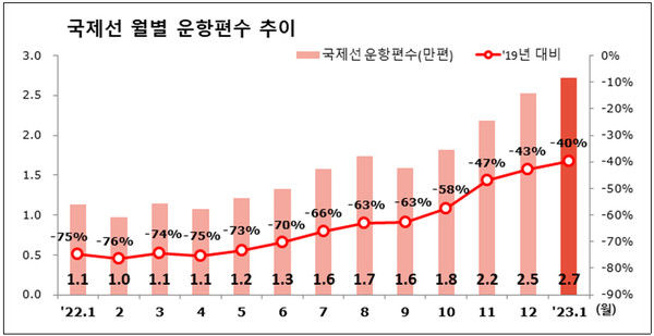 국제선 여객 수는 지난해 10월 말부터 일본, 베트남, 태국 등 중·단거리 노선의 여행 수요가 폭발적으로 증가하면서 급증했다. 지난해 10월과 12월 국제선 여객 수는 2019년 같은 달 대비 약 35%, 약 53% 수준으로 회복했다.