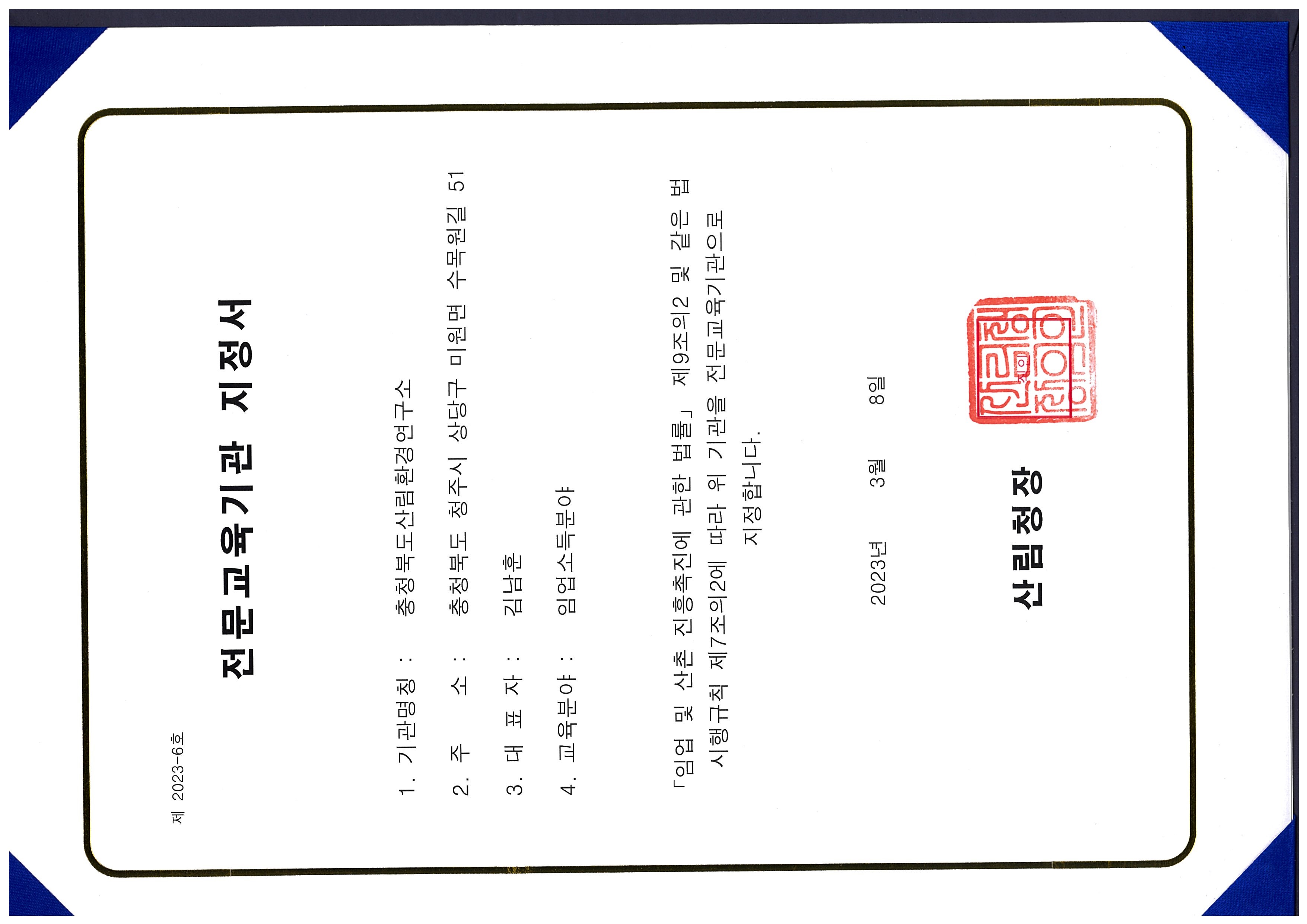 충북 산림환경연구소는 산림·임업분야 인재 양성을 위한 산림청 신규 전문 교육기관으로 지정되는 성과를 거두었다.