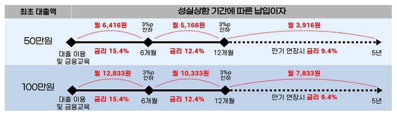 납입이자는 금융교육 이수 때 금리가 0.5%p 인하돼 50만 원 대출 때 최초 월 이자부담은 6416원 수준이며, 이자 성실납부 6개월마다 2차례에 걸쳐 금리가 3%p씩 인하돼 6개월 후 5166원, 추가 6개월 후 3916원으로 금리부담이 경감된다.