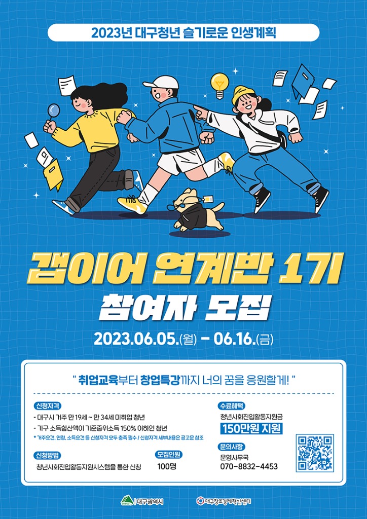 조경선 대구광역시 청년여성교육국장은 “대구청년 슬기로운 인생계획 지원사업은 대구에 거주하는 모든 청년들이 조건 없이 참여할 수 있도록 기획하여 올해 첫 시행하는 사업으로, 청년의 취·창업 역량 강화를 지원하는 이번 갭이어 연계반 모집에도 많은 청년들의 참여를 바란다”라고 말했다.