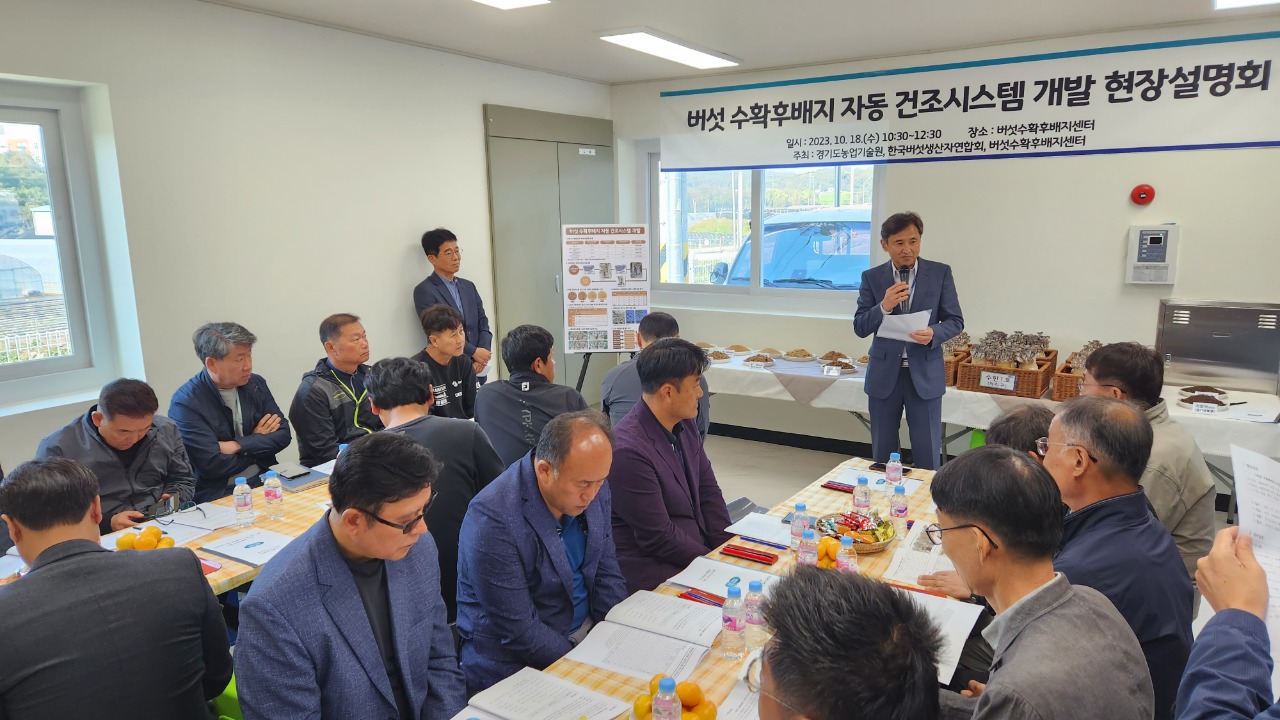 경기도농업기술원이 버섯 수확후배지 자동 건조시스템을 개발하고 18일 여주시 버섯 수확후배지센터에서 현장설명회를 개최했다.