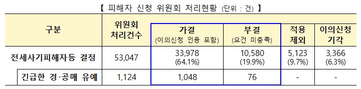 나머지 866건 중 522건은 요건 미충족으로 부결되었고, 173건은 보증보험 및 최우선변제금 등으로 보증금 전액 반환이 가능하여 적용제외 되었다. 또한 이의신청 제기 중 171건은 여전히 요건을 충족하지 못한 경우로 판단되어 기각되었다.