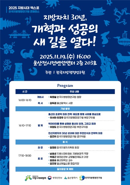한국지방행정연구원(원장 육동일)은 11월 19일(수) 오후 4시 울산전시컨벤션센터(UECO)에서 ‘지방자치 30년, 개혁과 성공의 새 길을 열다!’를 주제로 특별 콘퍼런스를 개최한다. 본 행사는 ‘2025 대한민국 지방시대 엑스포’의 공식 프로그램 중 하나로, 지방자치 시행 30주년을 기념하고 향후 30년을 준비하기 위한 정책적 방향을 모색하는 뜻깊은 자리가 될 전망이다.