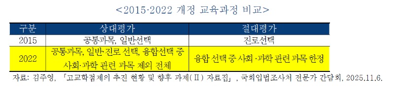 셋째, 현재 고1 학생이 내년부터 본격적으로 선택과목을 이수하게 되는데, 선택과목의 절대평가 전환 여부도 시급한 사항이기 때문에 국교위에서 신속히 검토하여 내년 학기 시작 전까지 결론을 내야 한다.