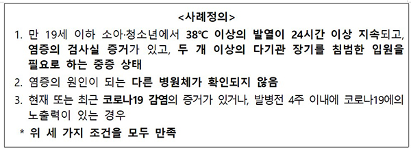 정 본부장은 “(이에 따라)다기관 염증증후군에 대한 국내 현황을 파악하고 신속히 대응하기 위해 해외 사례를 검토한다”며 “또한 국내 전문가들의 자문의견을 수렴해 신고대상 사례 정의와 신고 절차, 신고 시의 조사계획에 대한 지침을 마련해 시행에 들어갔다”고 설명했다.