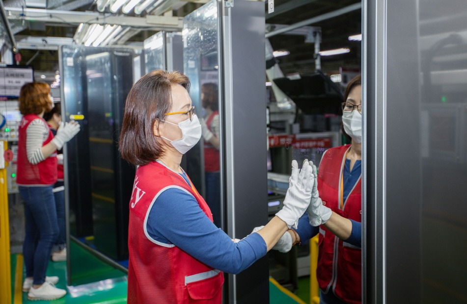 LG전자 직원들이 25일 경남 창원사업장에서 최대 6벌의 옷을 한 번에 관리할 수 있는 대용량 의류관리기 '트롬 스타일러 플러스'를 생산하고 있다.