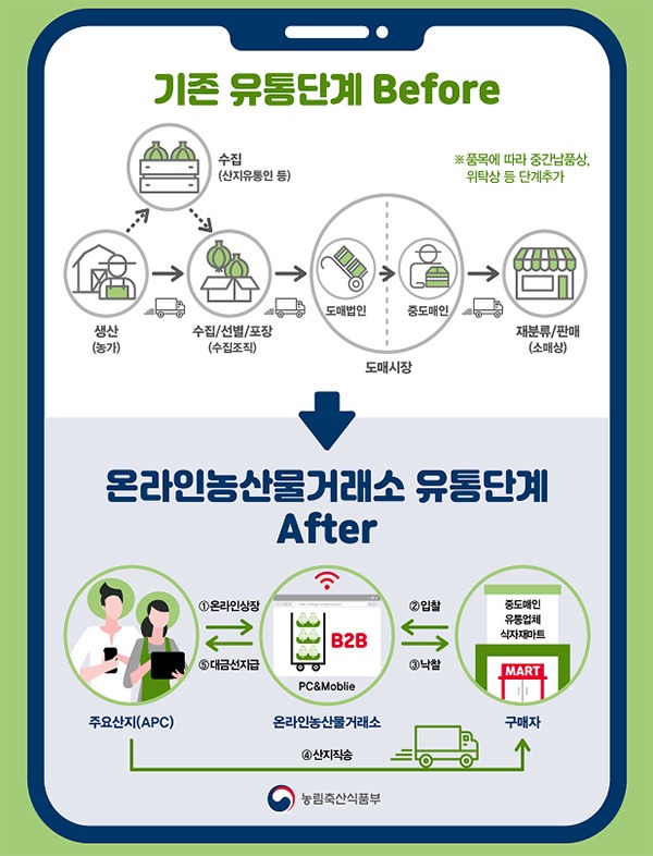 대량으로 거래되는 농산물 도매유통에도 온라인 거래방식을 도입하는 것으로 중간 유통비용을 줄이고 물량 집중 현상을 완화해 가격 급등락을 줄이기 위한 조치다.