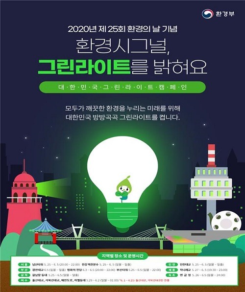 남산서울타워, 광안대교 등 전국의 각 도시를 대표하는 상징적인 장소를 녹색불로 밝히는 ‘초록불을 밝혀요(환경시그널 그린라이트)’ 행사도 5일까지 진행한다.
