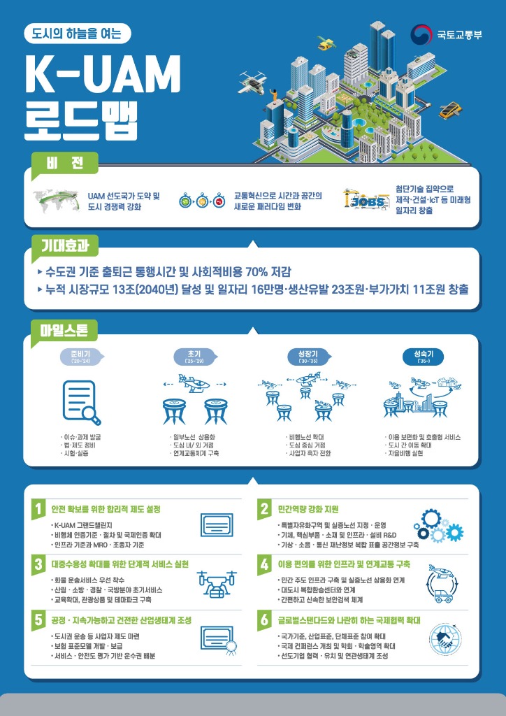 정부는 6월 4일, 제2차 혁신성장전략회의에서 하늘 길 출퇴근을 가능케 할 차세대 모빌리티인 도심항공교통(UAM, Urban Air Mobility)의 ’25년 상용화 서비스 개시를 주 내용으로 하는 「한국형 도심항공교통(K-UAM) 로드맵」을 확정·발표했다.