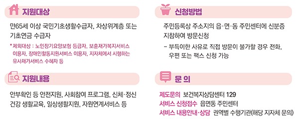 이밖에 주요내용과 신청방법, 신청 서류 등 자세한 정보는 관할 읍·면·동 주민센터, 보건복지상담센터(국번 없이 129) 또는 독거노인종합지원센터(1661-2129)에 문의하면 된다.