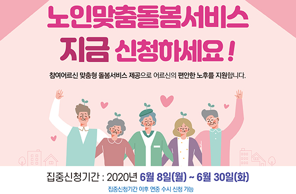 보건복지부는 코로나19에 따라 노인복지시설, 경로당 등의 시설 이용이 제한되어 노인들의 사회적 단절 및 고독감이 깊어지는 상황에서 취약노인을 적극 발굴하고 돌봄서비스를 확대 제공하기 집중 신청기간을 운영한다고 밝혔다.