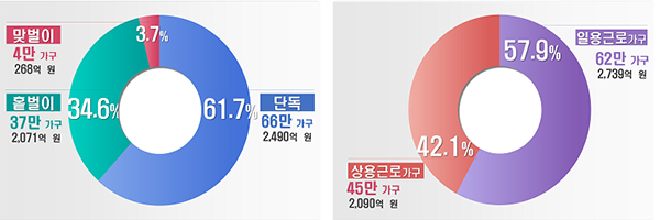 또 단독가구가 66만 가구(61.7%), 홑벌이가구가 37만 가구(34.6%), 맞벌이가구가 4만 가구(3.7%)로 단독가구의 비중이 높았다.