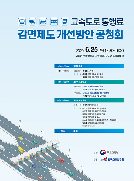 이날 공청회에서는 통행요금 감면제도 현황과 해외 사례 등을 소개한 뒤 한국교통연구원에서 통행요금 감면제도 개선방안에 대해 발표할 예정이다. 각계 전문가들의 토론도 이어진다.