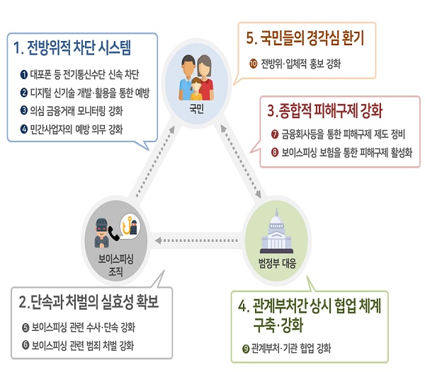 보이스피싱 척결 종합방안은 예방·차단–단속·처벌–피해구제–경각심 강화의 4단계에 대한 단계별 대응 강화로 구성됐다. 아울러 집행의 실효성을 높일 수 있도록 관계부처간 상시 협업 체계를 구축·강화한다.