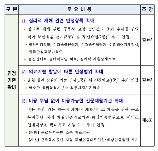 이번 개정안에 따르면 뇌혈관·근골격계 질환 등으로 인해 집중재활치료가 필요하거나 치료 후 직무 복귀를 준비하는 공상 공무원들이 자비 부담 없이 이용할 수 있는 전문재활기관을 확대한다.