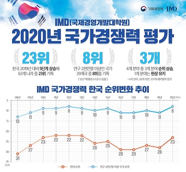 이같은 긍정적인 평가는 한국의 국가경쟁력을 향상시키는 원동력이 되기도 했다. 스위스 국제경영개발대학원(IMD)이 매년 평가하는 국가경쟁력 순위에서 우리나라는 지난해보다 5계단 오른 23위를 기록했다. 이는 2011∼2013년에 기록한 최고 순위인 22위에 근접한 수치다.