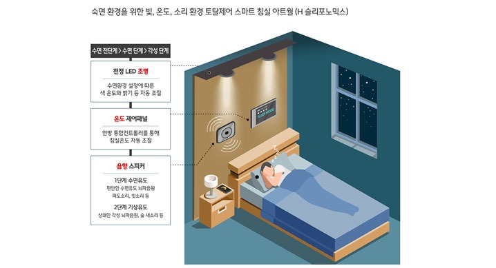 침실 아트월에는 적정 조명의 밝기 조절이 가능한 천정 LED 조명과 수면 단계별로 수면 유도음이 송출되는 스피커, 단계별 최적의 온도 조절이 가능한 제어 패널이 통합 빌트인 된다.