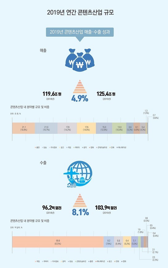 2019년도 국내 콘텐츠산업 매출액은 전년대비 4.9% 증가한 125조 4천억 원으로 추정된다. 이는 지난해 우리나라 경제성장률이 전년대비 2.0% 증가했고, 지난 5년 간 전 산업 매출액 연평균이 3.8% 성장한 수치와 비교하면 주목할 만한 성과이다. 매출액은 콘텐츠산업 전 부문에서 증가했으며 그 가운데 ▲애니메이션(11.2%) ▲지식정보(9.1%) ▲음악(8.9%) 산업이 높은 증가율을 보여 국내 콘텐츠산업 성장에 크게 기여한 것으로 풀이된다.