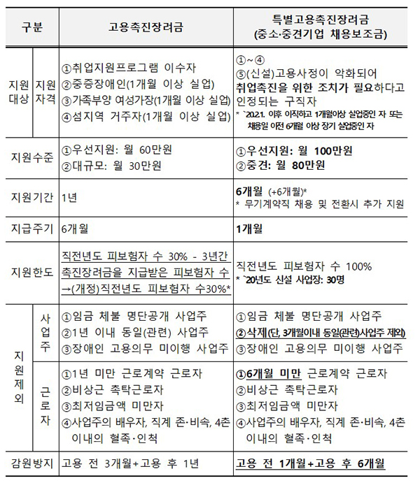 이 중 현행 지원 대상자는 노동부 장관이 고시한 취업지원 프로그램 이수자 또는 중증장애인 등 이수 면제자로, 신규 고용 근로자 1인당 중소기업은 월 최대 100만원, 중견기업은 80만원을 최대 6개월간 지원한다.