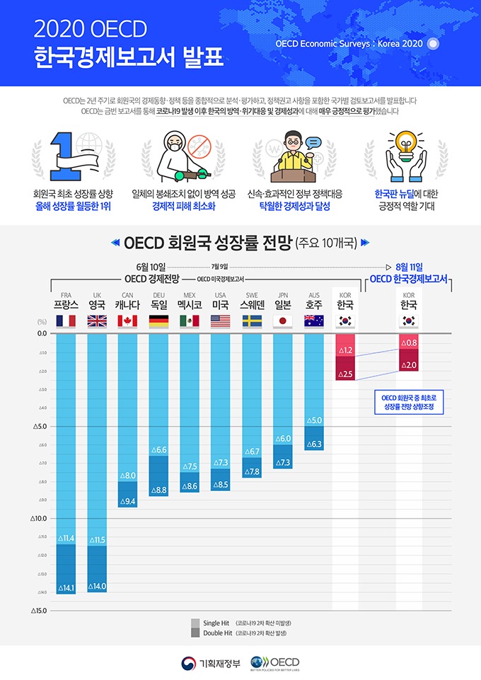 OECD는 11일 공개한 ‘2020 OECD 한국경제보고서’에서 올해 우리나라 성장률이 -0.8% 기록할 것이라고 밝혔다. 이는 지난 6월 제시한 -1.2%보다 0.4%p 높인 것이다. 2분기 국내총생산(GDP)까지 반영했고, 코로나19 확산이 없는 상황을 전제했다.