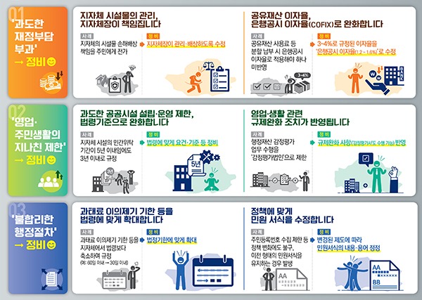 정부는 국무조정실(경제사회인문연구회)·법제처(법제연구원)·행정안전부에서 문제 사례를 발굴하고, 조사결과에 대한 부처별 검토를 거쳐 지자체의 정비상황을 관리하는 협업체계를 구축했다.