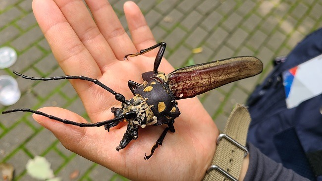 이번에 발견된 장수하늘소 성충은 조류에 의한 공격으로 몸통의 일부가 파손된 상태였다.