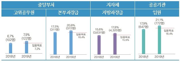 또한 2019년 공공부문 여성 관리자 임용목표를 모든 영역에서 초과 달성했다.