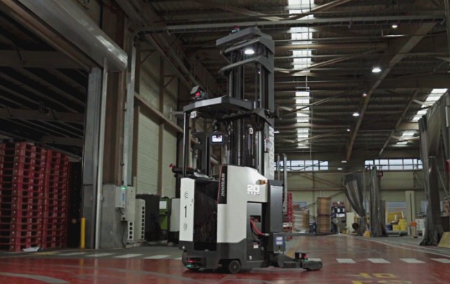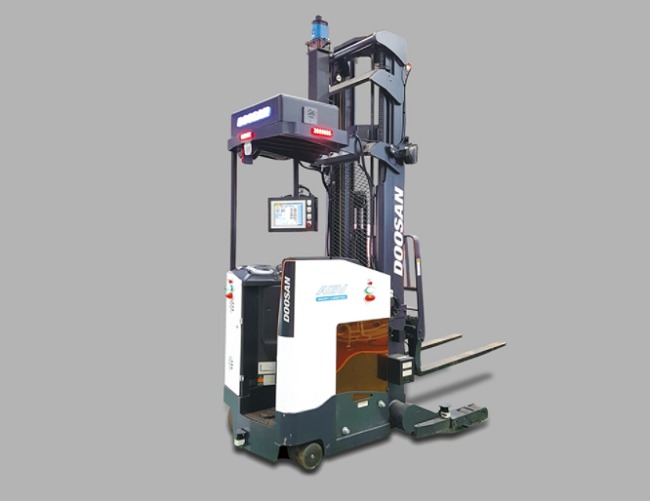 ㈜두산의 무인지게차는 안전하고 효율적인 작업과 정밀한 운전이 특징이다.