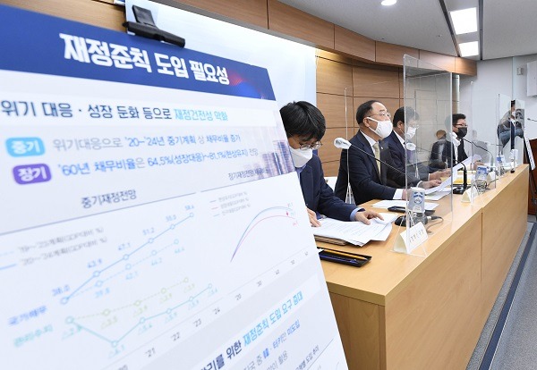 이어 “재정수지는 통합재정수지가 국제사회에서 보편적으로 통용되는 만큼 이를 토대로 해 그 기준을 –3%로 설정했다”며 “코로나위기 극복과정에서 이미 통합재정수지가 -3%를 넘어 -4%까지 이르고 있는 점을 감안하고 향후 재정여건 및 수지 전망 등도 함께 고려했다”고 덧붙였다.
