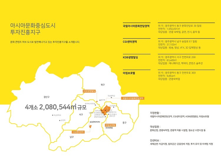 문체부는 투자진흥지구를 활성화하고 입주기업이 빠르게 정착할 수 있도록 박람회 참가 지원 외에도 ▲ 조세(국세와 지방세) 감면, ▲ 임대료 감면, ▲ 기업 종합(원스톱) 지원을 위한 투자진흥지구 지원센터 운영, ▲ 자금 지원(고용·이전·상담 보조금 등), ▲ 아시아문화중심도시 펀드(2호) 투자, ▲ 입주공간 및 공동이용시설 운영, ▲ 우수사업 아이디어 공모전 등 다양한 지원정책을 추진하고 있다.