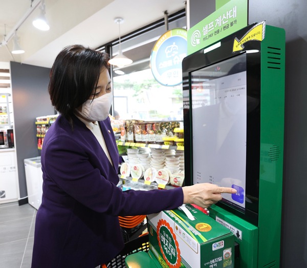 이날 행사에는 중기부 박영선 장관이 참석, 스마트슈퍼 1호점 현판식을 진행하고 이어 무인 출입과 셀프계산 등 스마트기술을 시연했다.