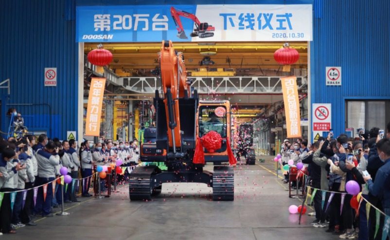 두산인프라코어 중국법인은 지난달 30일 임직원들과 대리상, 고객들을 옌타이 공장으로 초청해 20만호기 생산 기념행사를 열었다. 온라인으로 생중계된 이날 행사에서는 20만 번째로 생산된 굴착기를 고객에게 넘기는 전달식도 가졌다.