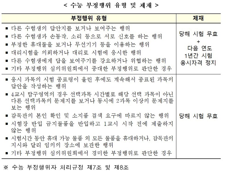 수험생이 부정행위를 할 경우 그 유형에 따라 당해 시험이 무효가 되거나 당해 시험 무효와 함께 다음 연도 1년 동안 수능 응시 자격이 정지된다.